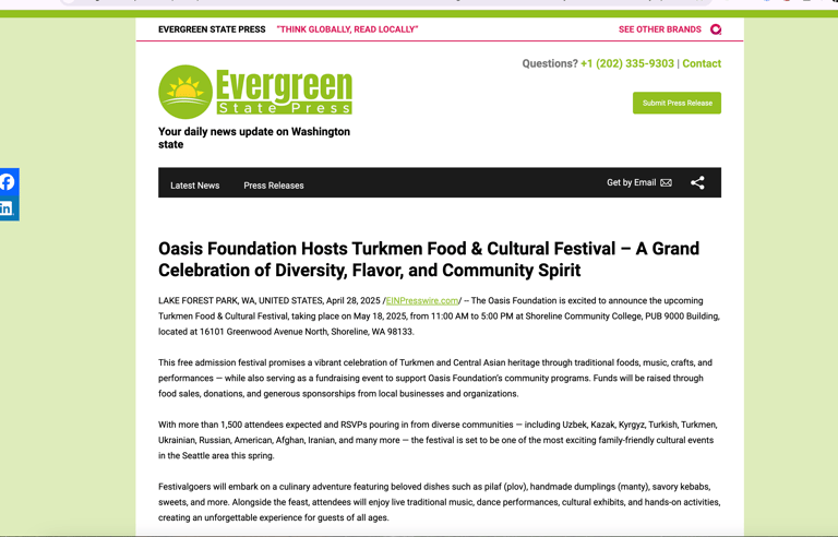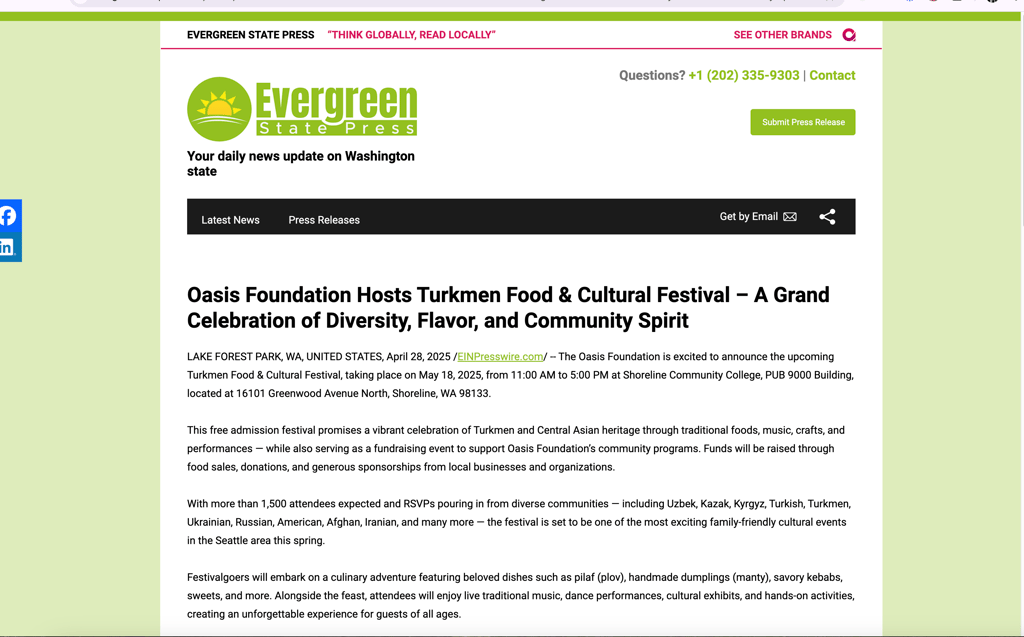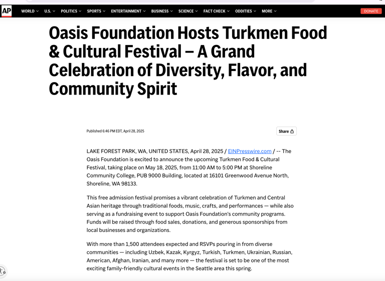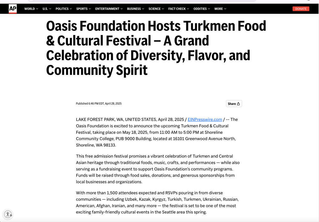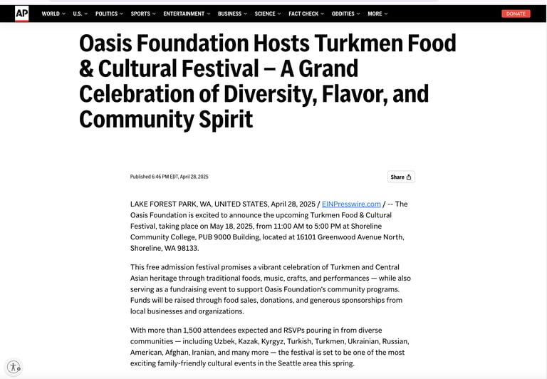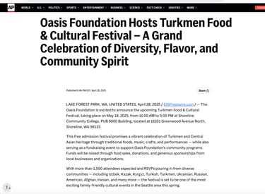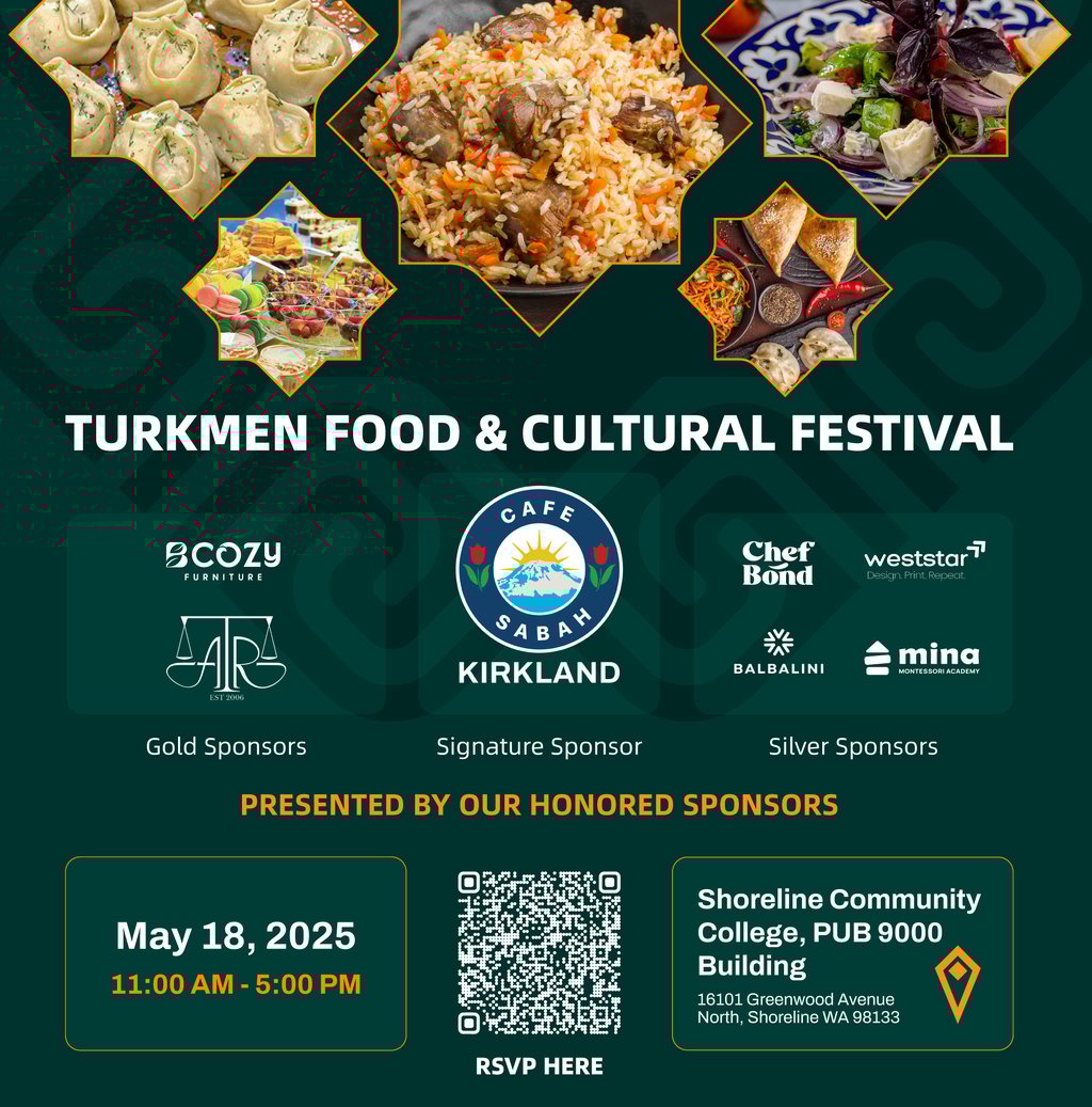 Shoreline, WA – May 18, 2025 | 11:00 AM – 5:00 PM - The Oasis Foundation is proud to present the Turkmen Food and Cultural Festival, a vibrant, family-friendly event taking place on Sunday, May 18th at Shoreline Community College from 11:00 AM to 5:00 PM. This admission-free celebration of Turkmen culture is open to the public and is expected to attract more than 2,000 attendees from across the Seattle area and beyond.