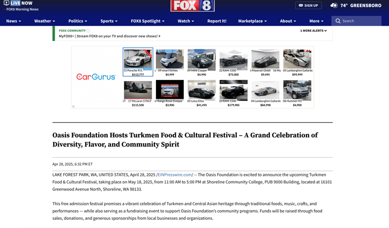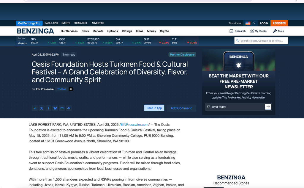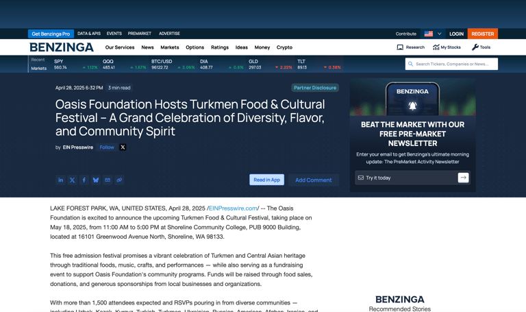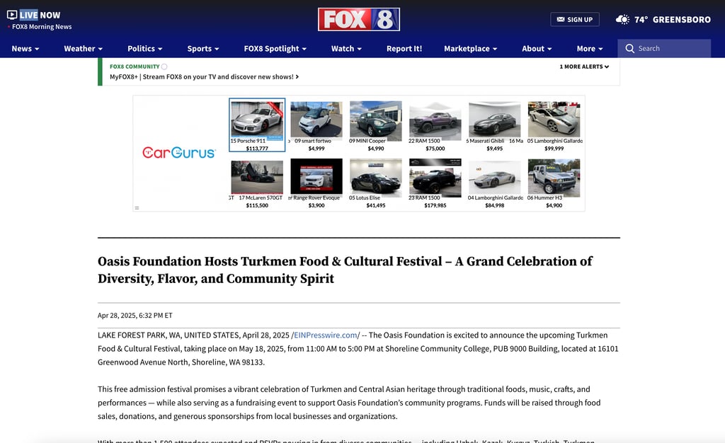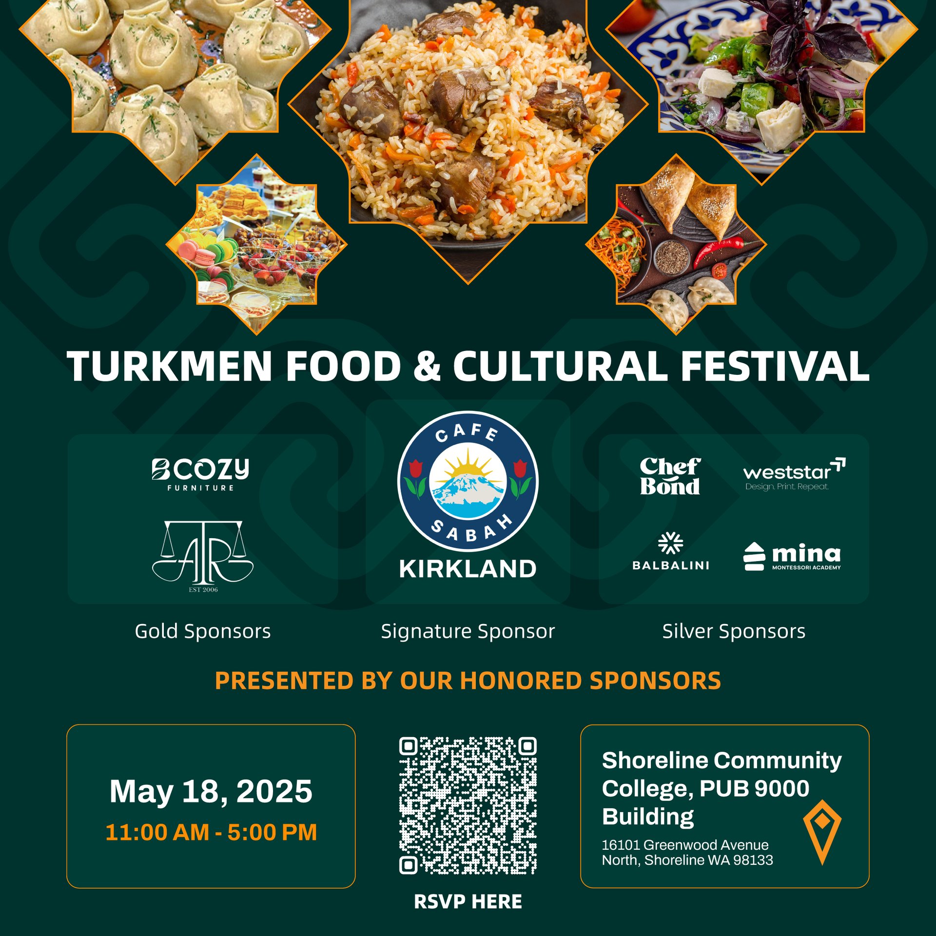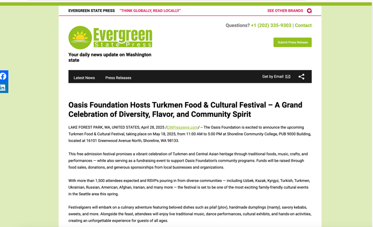 Shoreline, WA – May 18, 2025 | 11:00 AM – 5:00 PM - The Oasis Foundation is proud to present the Turkmen Food and Cultural Festival, a vibrant, family-friendly event taking place on Sunday, May 18th at Shoreline Community College from 11:00 AM to 5:00 PM. This admission-free celebration of Turkmen culture is open to the public and is expected to attract more than 2,000 attendees from across the Seattle area and beyond.